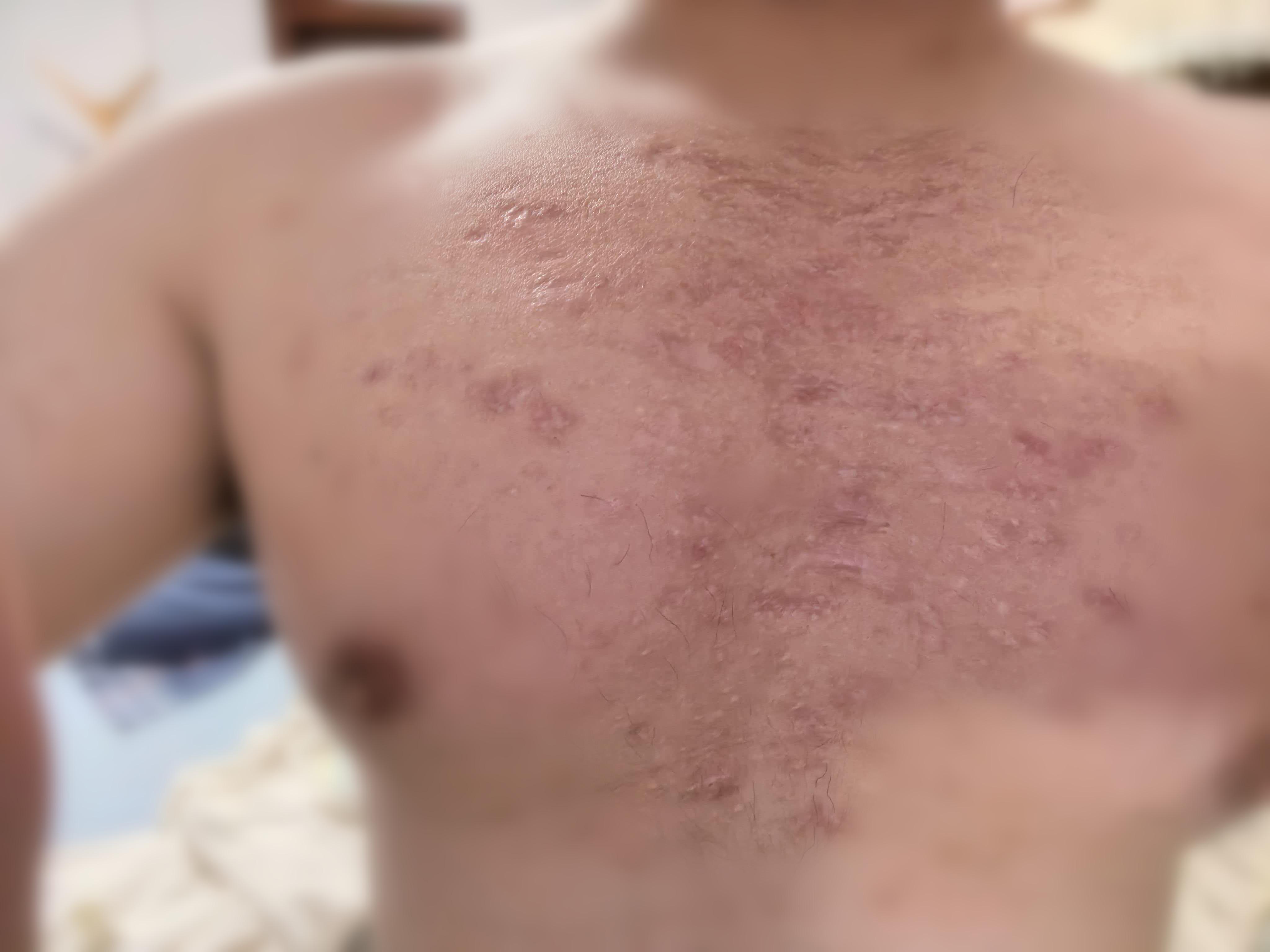 章先生的困扰始于9年前。彼时,他前胸部无明显诱因出现多发毛囊炎,愈合后形成皮肤肿物,随后逐渐扩大、隆起,甚至侵犯周围正常皮肤。疼痛与瘙痒在出汗时尤为剧烈,范围蔓延至约35厘米×25厘米,严重影响了生活与心理。“以前上学时不敢脱衣服,怕被同学嘲笑、乱讲话。毕业后也害怕被同事知道,心理上很折磨。”章先生回忆道。他的父亲也半开玩笑地感慨:“胸前那么多疙瘩,真怕儿子以后找不着媳妇。”