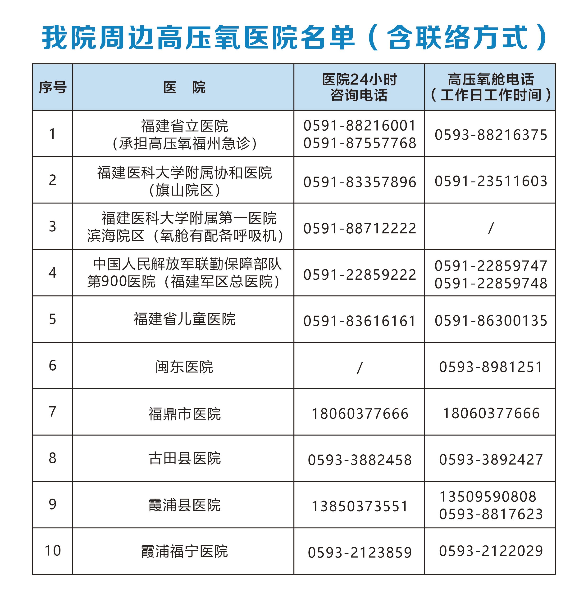 各位患者及家属: 我院高压氧舱已投入使用超十年,为进一步保障医疗质量与诊疗安全,消除设备运行潜在隐患,确保医疗服务有序开展,根据医院整体工作部署,高压氧舱将开展全面停舱大修工作。现将相关事宜通知如下: 停舱时间:2026年4月16日起,预计停舱35天,具体恢复时间将根据大修进度另行通知。 停舱期间,高压氧舱科所有诊疗服务暂停,给您带来的不便,敬请谅解。 大修完成后,我院将第一时间发布恢复使用通知,望大家密切关注医院官网和公众号。 为方便患者就近选择其他高压氧舱治疗服务,现提供部分附近医院信息如下(具体服务时间、预约方式及诊疗安排可能动态调整,建议提前电话确认并咨询转诊需求)。 特此通知,感谢您的理解与配合! 宁德市医院 2026年4月9日