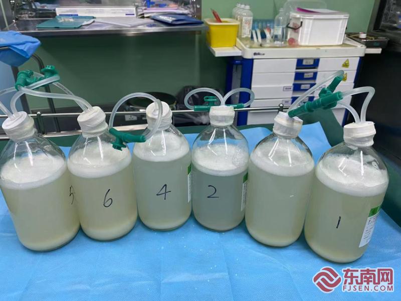 影像图。宁德市医院供图 在麻醉科、护理团队的紧密协作下,手术顺利完成。2次治疗共应用20000ml生理盐水进行肺灌洗,灌洗液从最初的“牛奶状”逐渐变得清亮。 术后,林先生气喘改善明显,氧合指数恢复正常,出院时更是打趣,感觉自己能跑全程马拉松!