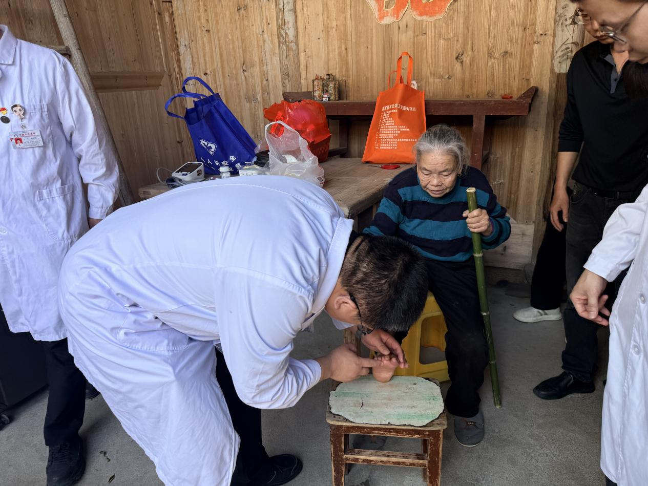作为去年移动医院入户诊疗的重点对象,83岁的占阿姨患有糖尿病足,去年巡诊时还因足部溃烂卧床,专家们一直牵挂着她的病情。当天上午9时许,巡诊团队刚下船,便直奔占阿姨家中复诊,看到老人足部溃烂已完全愈合、恢复良好,专家们随即为她测量血糖血压,发现其血糖正常但高压达209,偏高明显,便细致叮嘱医嘱,并现场赠送对症药品。