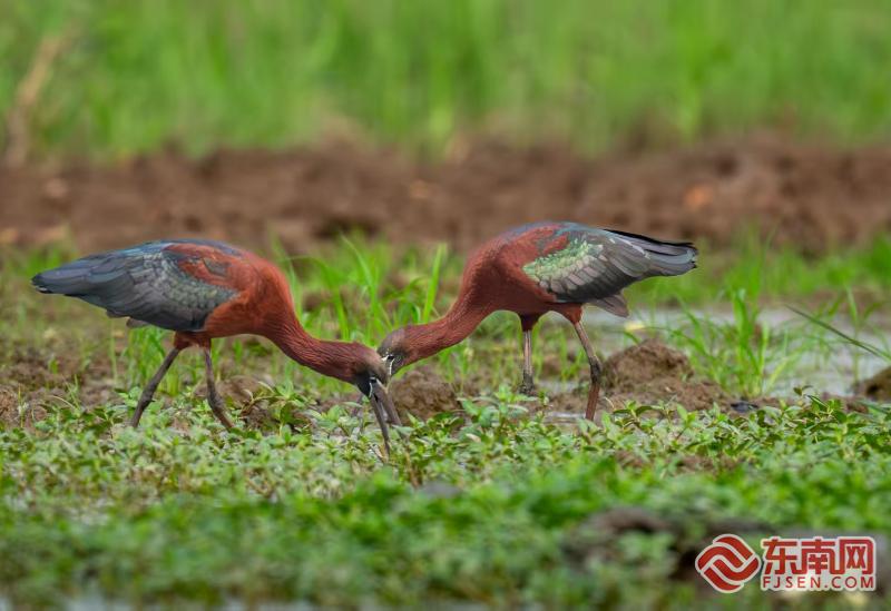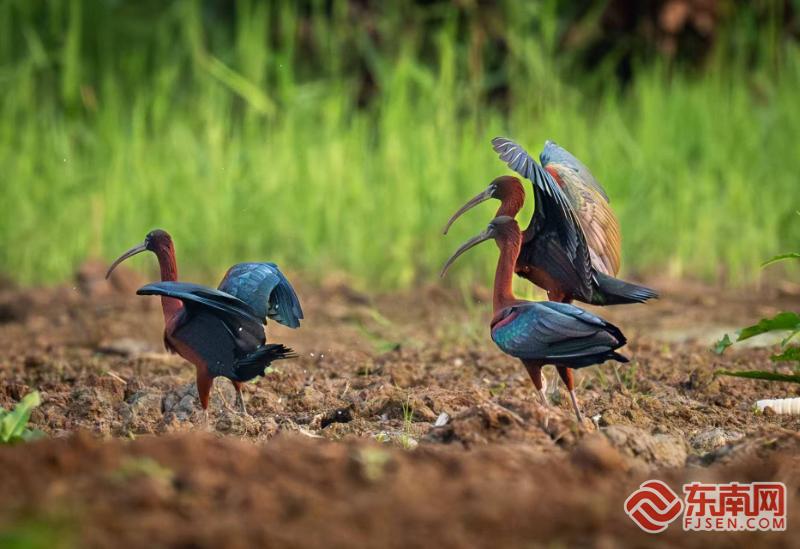 3只彩鹮在宁德市东湖公园水域悠然觅食。受访者 供图 观测影像显示,3只彩鹮在浅水区悠然漫步,细长弯曲的黑喙不时探入水中觅食,时而低头梳理羽毛,时而结伴低空掠过水面,通体羽毛在阳光下折射出铜绿、栗紫等金属光泽,姿态娴雅灵动。它们与周边白鹭、黑水鸡等鸟类和谐共处,构成一幅水清岸绿、生灵共生的生态画卷,为观测者留下清晰珍贵的影像资料。
