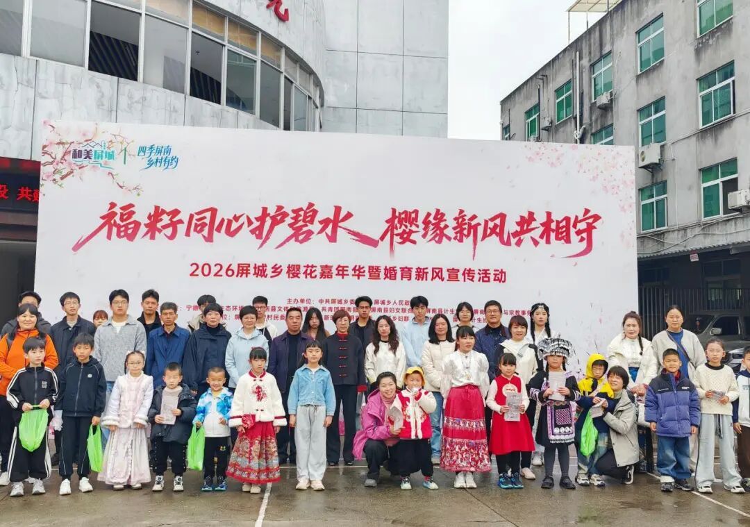 阳春三月,樱花烂漫,3月29日,屏南县计生协会联合多家单位举办的“福籽同心护碧水 樱缘新风共相守”2026樱花嘉年华暨婚育新风宣传活动在屏城乡南峭村浪漫启幕,吸引了众多徒步爱好者、单身青年、情侣夫妻齐聚樱花树下,共赴一场融合婚育新风、生态环保与民族风情的春日之约。