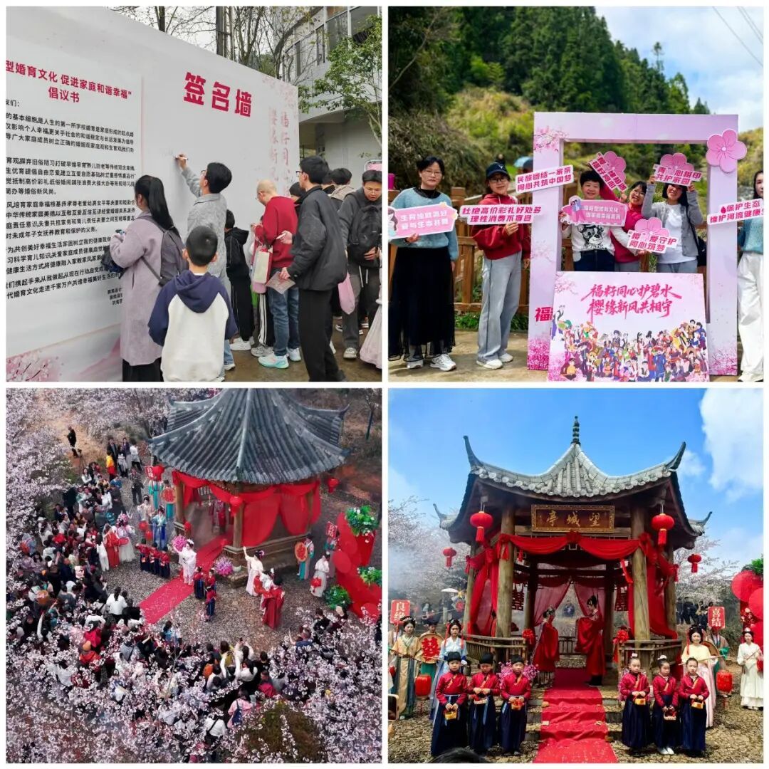 活动启动仪式现场设置的“弘扬新型婚育文化 促进家庭和谐幸福”倡议书签名墙前人头攒动,众多参与者纷纷主动签名,承诺以实际行动践行婚育新风理念。徒步沿途,大家在精心设置的婚育新风打卡点前拍照留念,在轻松步伐中感受文明风尚的浸润。樱花林间,“樱遇南峭·一生一世一双人”汉服实景演出唯美上演,演绎才子佳人相识、相知、相守的动人故事,巧妙融入传统婚俗元素,吸引广大群众驻足观看。