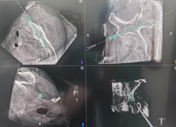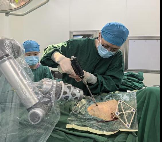 手术前,团队通过三维CT扫描获取骨盆精准影像,在电脑上规划出最佳的螺钉置入路径。骨科手术机器人接收指令后,机械臂精确定位,仅通过两个硬币大小的微创切口(约1.5厘米),在实时引导下顺利完成了髂骨螺钉及LC‑Ⅱ螺钉的置入。整个手术不到2小时,出血量仅约10毫升。