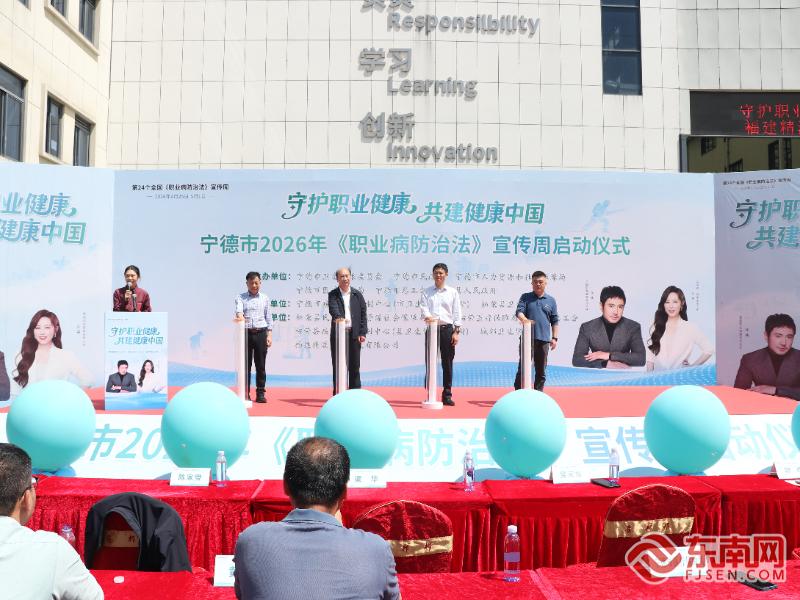 东南网4月27日讯(本网记者 周涛)4月27日,宁德市卫生健康委员会联合市民政局、市人力资源和社会保障局、市医疗保障局、市总工会及柘荣县人民政府,在柘荣县砚山洋工业园区共同启动2026年《中华人民共和国职业病防治法》宣传周活动。本次宣传周以“守护职业健康 共建健康中国”为主题,多部门协同发力,整合政策解读、健康服务与专业指导,为全市劳动者筑牢职业健康防护屏障。