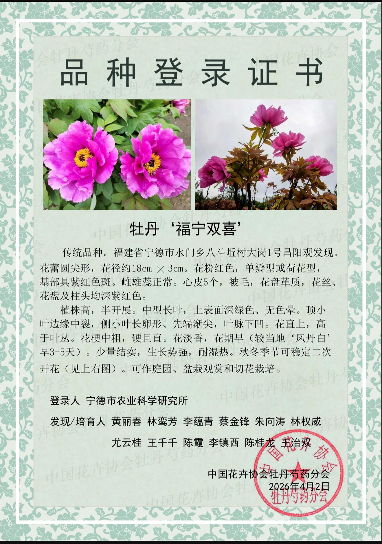 品种登录证书。宁德市林业局供图 经专业鉴定,“福宁双喜”性状优良,兼具极高的观赏价值、实用价值与科研育种价值,更是南方耐湿热牡丹育种的优秀亲本,其强健的耐湿热特性的遗传稳定性强,可有效弥补南方牡丹育种中耐湿热亲本稀缺的短板,为培育更多适应南方气候的牡丹新品种提供优质种质支撑,破解长期以来南方牡丹栽培难、育种难的困境。该品种花蕾呈圆尖形,花径约18cm×3cm,花粉红色,呈单瓣型或荷花型,基部带有紫红色斑,雌雄蕊发育正常,心皮5个且被毛,花盘革质,花丝、花盘及柱头均为深紫红色;植株高大、呈半开展状,叶片为中型长叶,上表面深绿色、无色晕,顶小叶边缘中裂,侧小叶呈长卵形、先端渐尖,叶脉下凹;花朵直上且高于叶丛,花梗中粗、硬且直,花开时带有淡香,花期较当地“凤丹白”早3至5天,少量结实,生长势强健且耐湿热,尤为罕见的是,该品种具备秋冬季节稳定二次开花的特性,可实现“春秋双季绽放”,适合用于庭园观赏、盆栽种植及切花栽培,同时适配茶园、果园、林下套种模式,能充分利用土地空间,实现立体种植增收,契合南方农业多元化发展需求。 牡丹在闽东地区的成功培育并非一蹴而就。早在2014年,宁德市立项“牡丹花南移商业栽培技术研究”,为牡丹在闽东地区的引种栽培奠定基础;后续省林业局、省科技厅等部门先后立项的“观赏牡丹优良品种引种试验及繁育技术研究”“福建培育牡丹春节催花栽培关键技术研究”等项目,有效推动牡丹品种筛选与繁育技术优化及优质种质资源选育。牡丹“福宁双喜”的成功登录,是宁德市林业科技创新与特色花卉产业发展的重要成果,为宁德市打造特色花卉产业、推动生态产业融合发展提供了新的抓手,也为南方牡丹产业多元化发展指明了方向。 记者从宁德市农业科学研究所获悉,下一步,宁德市将持续加大对牡丹等特色花卉产业的扶持力度,支持科研团队进一步深化牡丹育种、栽培技术研究,重点依托“福宁双喜”这一优秀耐湿热亲本开展育种工作,同时推广茶园、果园、林下套种模式,提升土地利用效率和种植效益;立足南方市场需求,拓展牡丹产业多元用途,推动南方牡丹种苗繁育、鲜切花供应、药用开发(根皮入药称“丹皮”,具清热凉血、活血散瘀功效)、花茶加工(富含牡丹黄酮、氨基酸等营养成分,可制成养生花茶)、保健品研发、食品加工(可制作牡丹糕、牡丹羹、牡丹酱等产品)等多领域协同发展,将其打造为南方牡丹产业的核心发展方向。同时加强新品种推广应用,推动牡丹产业与生态旅游、乡村振兴深度融合,让“花中之王”成为闽东生态美、产业兴、百姓富的新名片。 |