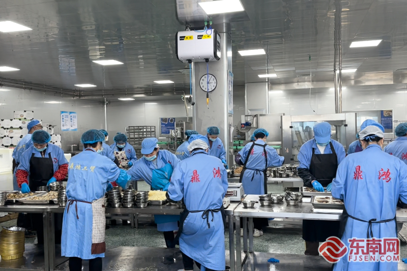 鼎鸿工贸预制菜生产线开足马力,备货“年货节”。受访者供图 走进霞浦鼎鸿工贸新厂房加工车间,两条预制菜生产线正开足马力运转着,工人们有条不紊地进行清洗、挑选、包装等工作,为即将到来的“年货节”加紧备货。 “我们家的黄鱼鲞都是新鲜活鱼上岸就直接加工的,味道超赞。”“这款即食海参口感很好,口味升级,食用方便,老少皆宜。”……在加工车间二楼,主播们正卖力推介,将霞浦的鲜美介绍给全国。