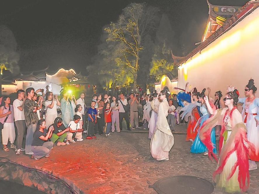 国庆中秋假期,在周宁县鲤鱼溪景区,身着汉服的演员翩然起舞,国潮风十足的表演引得游客拍照打卡。